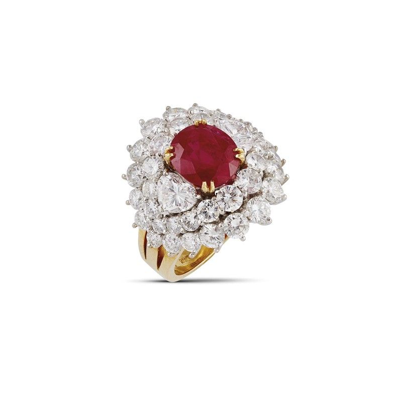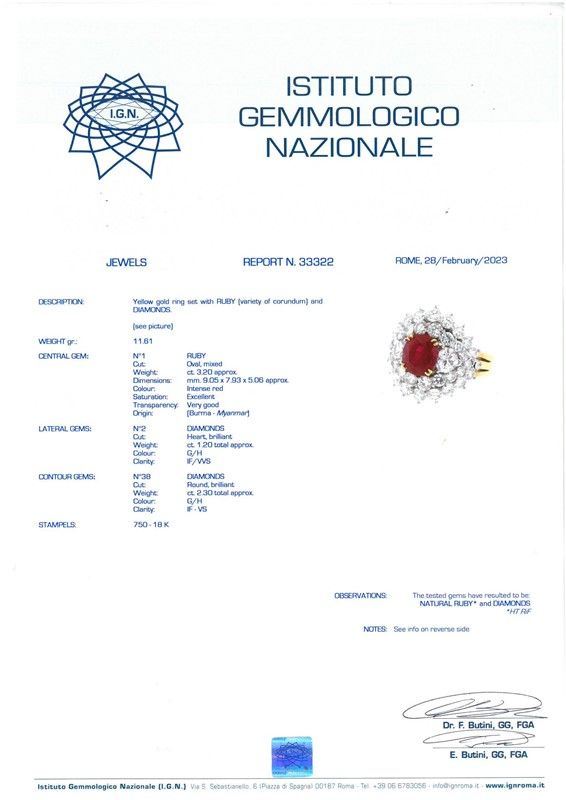 ANELLO CON RUBINO BIRMANO E DIAMANTI in oro giallo e bianco 18kt, impreziosito al centro da un rubino taglio ovale di ct 3.20 circa, affiancato da due diamanti taglio a cuore per ct 1.20 circa, circondato da pavé di diamanti taglio brillante per ct 2.30 circa, colore G/H, purezza IF/Vs, punzoni 750 e 18kt, mis. 55, gr. 11. Corredato di certificato IGN del 28/02/2023 attestante le caratteristiche e l'origine geografica del rubino.