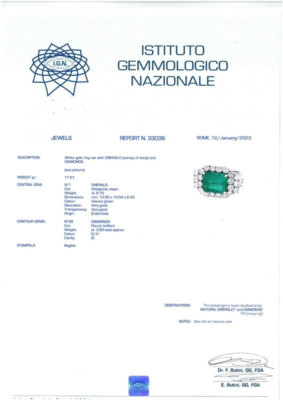 ANELLO CON SMERALDO COLOMBIANO E DIAMANTI in oro bianco 18kt, con al centro uno smeraldo colombiano taglio ottagonale di ct 6.10, circondato da diamanti taglio brillante per ct 3.80 circa, mis. 55, gr. 6. Corredato di certificato IGN del 12/01/2023 attestante le caratteristiche e l'origine geografica della pietra.