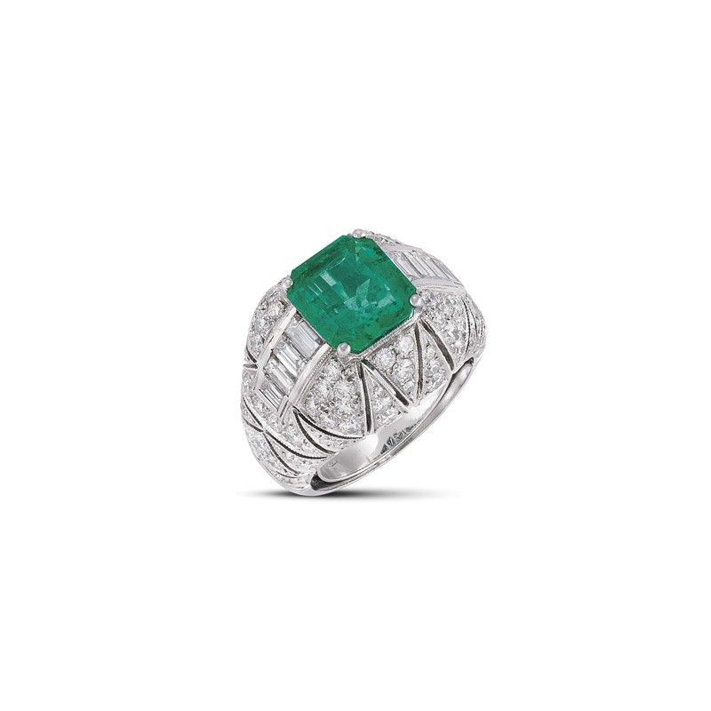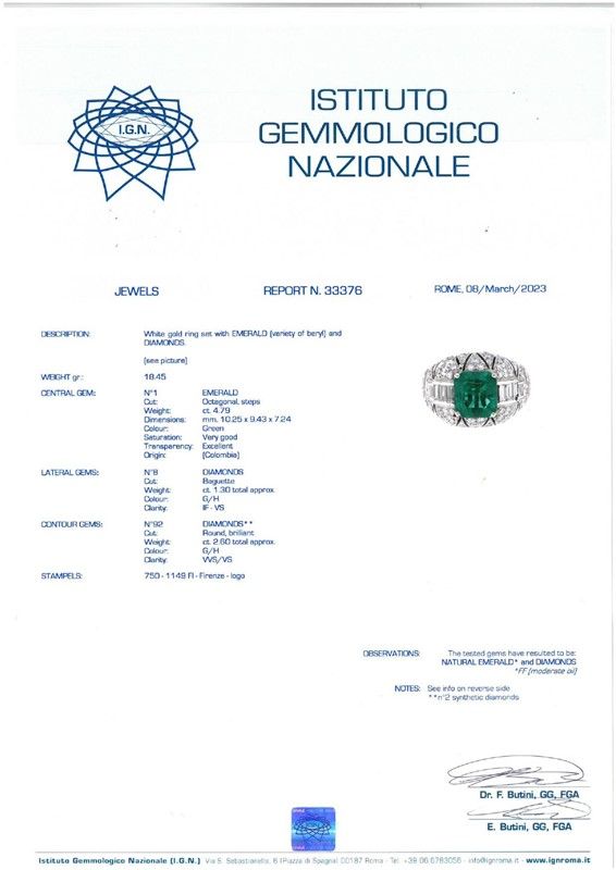 ANELLO CON SMERALDO COLOMBIANO E DIAMANTI in oro bianco 18kt, con al centro uno smeraldo colombiano taglio ottagonale di ct 4.79, circondato da diamanti taglio baguette per ct 1.30 circa e da diamanti taglio brillante (di cui due sintetici) per ct 2.60 circa, punzoni 750 e del fabbricante, mis. 53, gr.18. Corredato di certificato IGN del 08/03/2023 attestante le caratteristiche e l'origine della pietra.