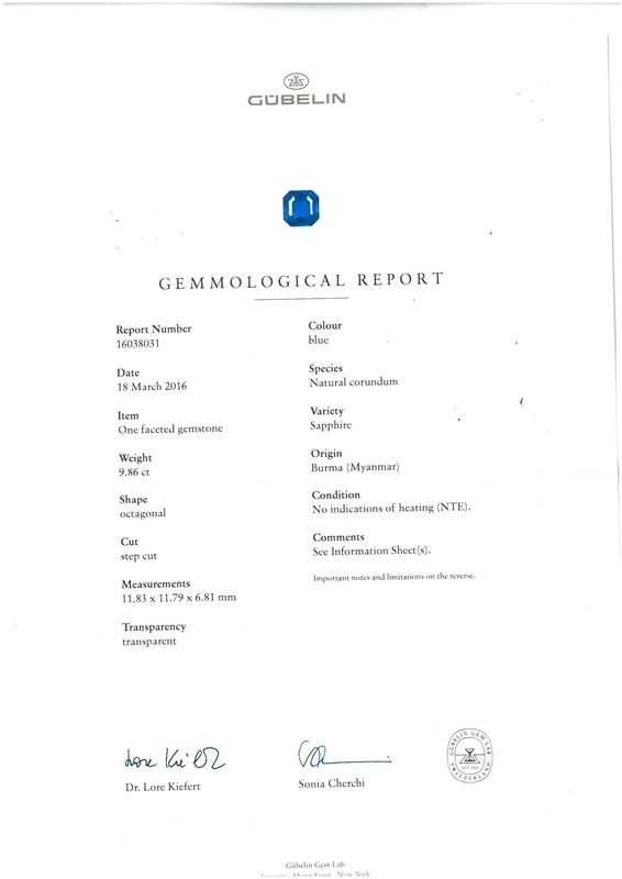 ANELLO CON ZAFFIRO BIRMANO E DIAMANTI in platino, impreziosito al centro da uno zaffiro birmano taglio ottagonale di ct 9.86, circondato da pavé di diamanti taglio brillante per ct 2 circa, mis. 53, gr. 13. Corredato di certificato Gubelin del 18/03/2016 attestante l'origine della pietra e l'assenza di trattamenti termici.