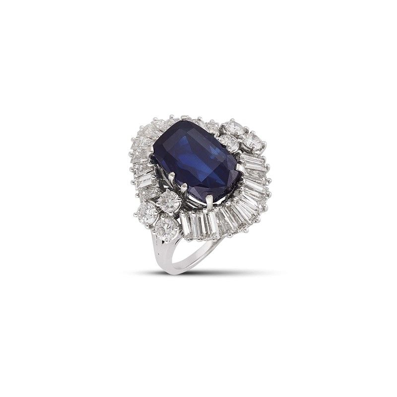 ANELLO CON ZAFFIRO BIRMANO E DIAMANTI in oro bianco 14kt, con al centro uno zaffiro birmano taglio cuscino di ct 10.54 circa, circondato da diamanti taglio brillante e tapes per ct 3.80 circa, colore J-L, purezza Vs, mis. 55, gr. 10. Corredato di certificato IGN del 05/11/2018 attestante l'origine della pietra e l'assenza di trattamenti termici.