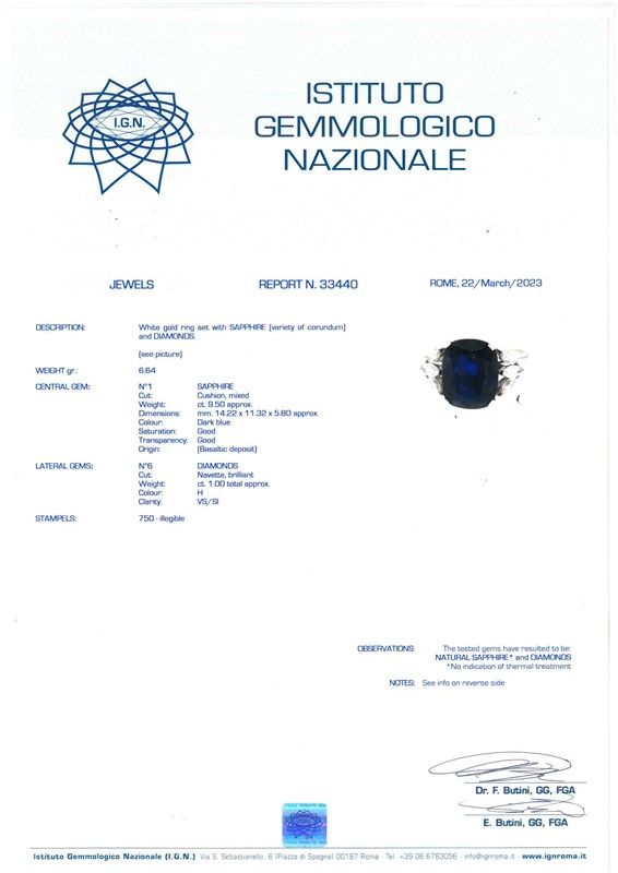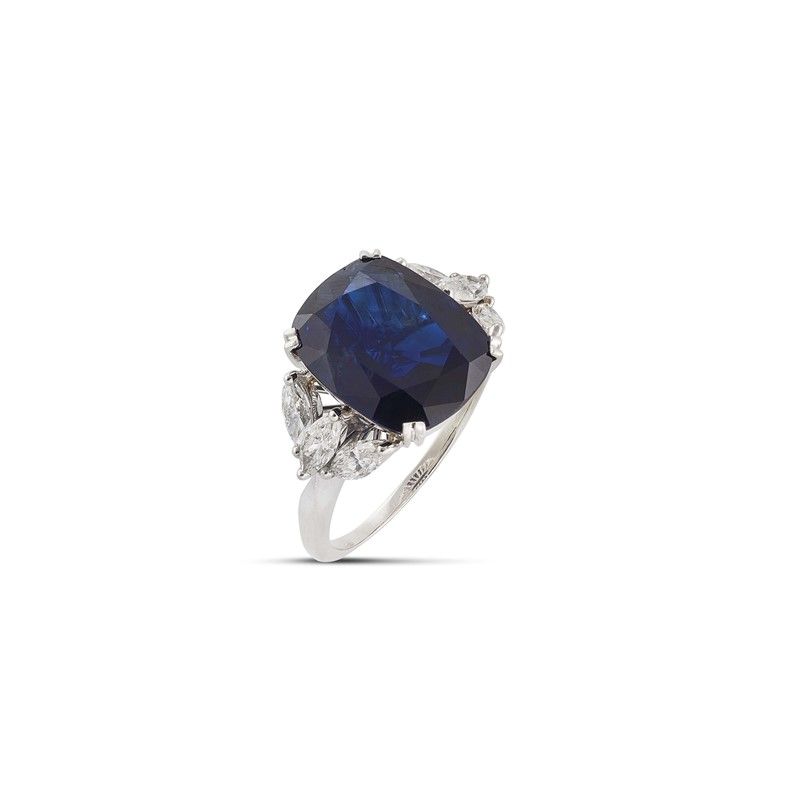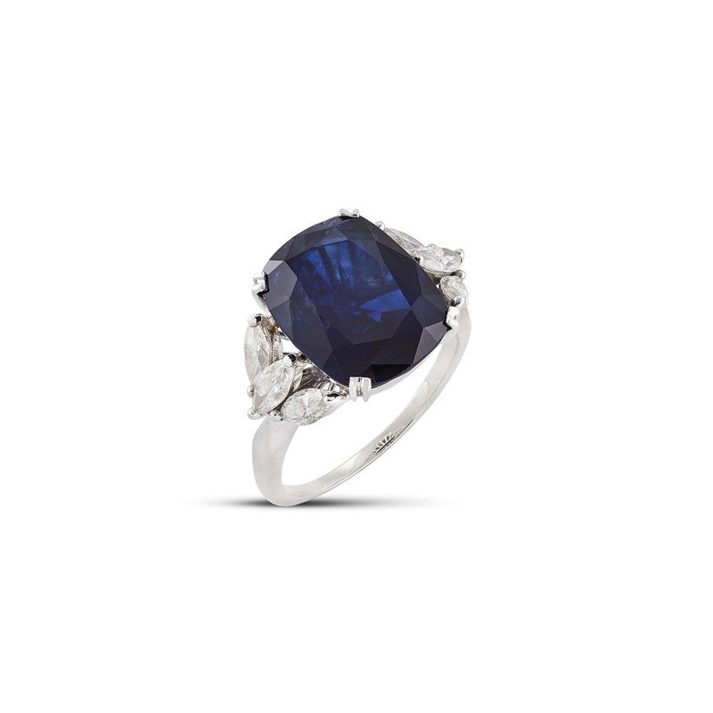 ANELLO CON ZAFFIRO E DIAMANTI in oro bianco 18kt, con al centro uno zaffiro taglio cuscino di ct 9.50 circa, affiancato da sei diamanti taglio navette per ct 1 circa, colore H, purezza Vs/SI, punzone 750, mis. 56, gr. 6. Corredato di certificato IGN del 22/03/2023 attestante le caratteristiche e l'assenza di trattamenti termici.