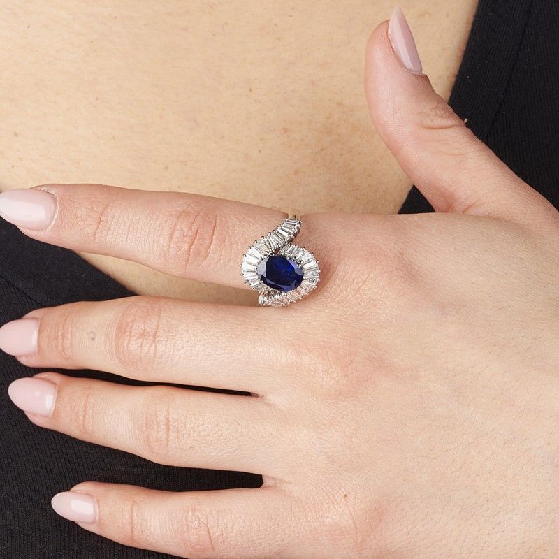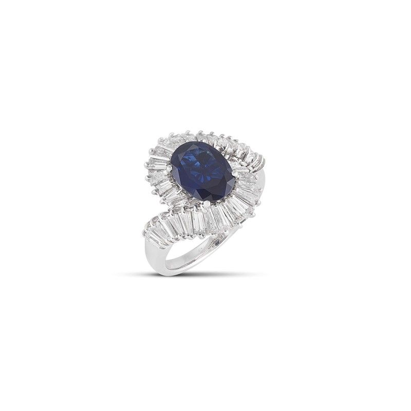 in oro bianco 18kt, impreziosito al centro da uno zaffiro taglio ovale di ct 2.62, avvolto da una doppia fila di diamanti taglio baguette e tapes per ct 1.70 circa, mis. 54, gr. 7