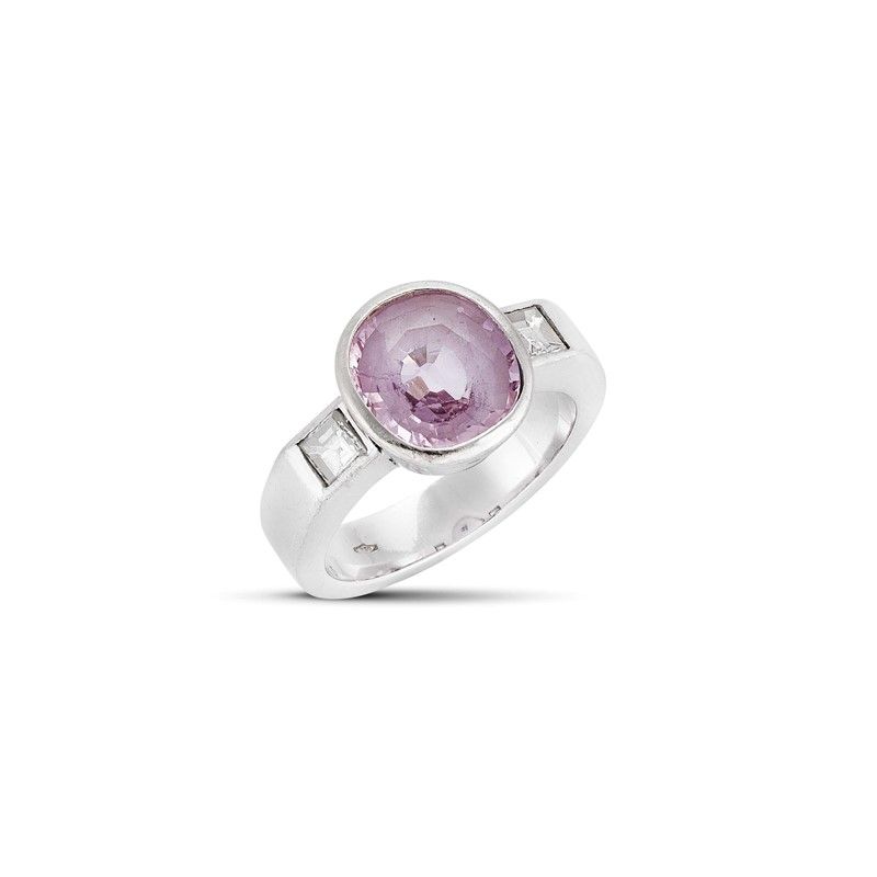 ANELLO CON ZAFFIRO ROSA BIRMANO E DIAMANTI in oro bianco 18kt, con al centro uno zaffiro rosa taglio ovale di ct 3.10 circa, affiancato da due diamanti taglio carré per ct 0.45 circa, colore G, purezza IF/Vvs, punzone 750, mis. 49, gr. 8. Corredato di certificato IGN del 15/03/2023 attestante l'origine geografica della pietra e l'assenza di trattamenti termici.