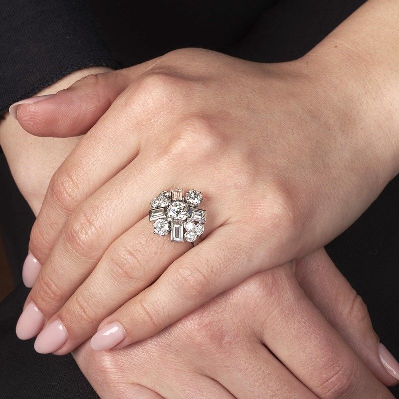 in oro bianco 18kt, impreziosito da diamanti taglio rotondo per ct 2.20 circa e quattro diamanti taglio baguette per ct 1.40 circa, punzone 750, mis. 54, gr. 7