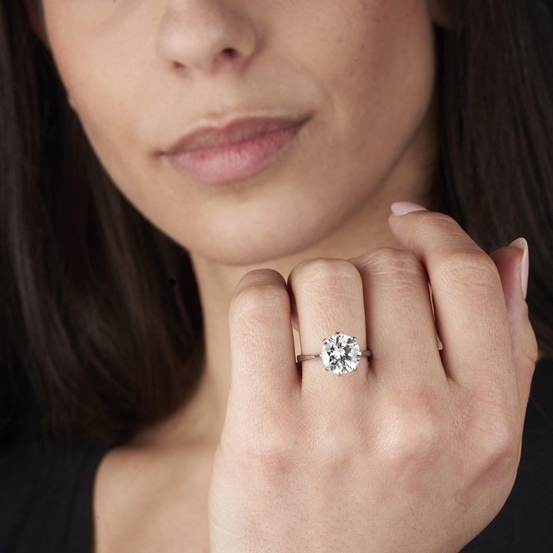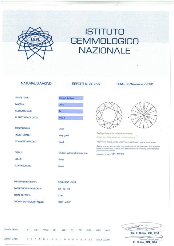 in oro bianco 18kt, con diamante taglio brillante di ct 3.42, colore M, purezza Vvs1, punzoni 750 e del fabbricante, mis. 52, gr. 4. Corredato di certificato IGN del 22/11/2022 attestante le caratteristiche.