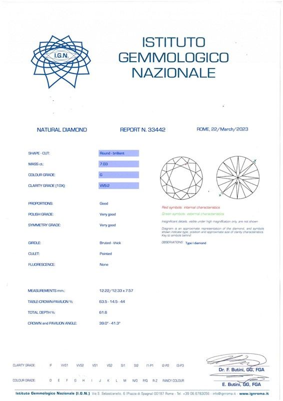 in oro bianco 18kt, con diamante taglio brillante (smontato) di ct 7.03, colore G, purezza Vvs2, mis. 58, gr. 4. Corredato di certificato IGN del 22/03/2023 attestante le caratteristiche.