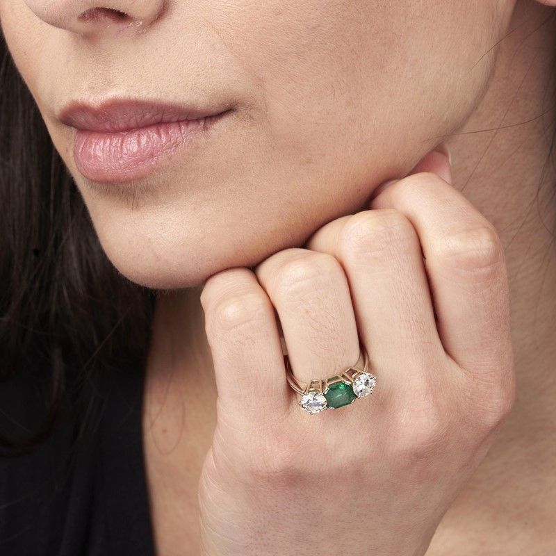 EMERALD AND DIAMOND TRILOGY RING IN 18KT WHITE GOLD