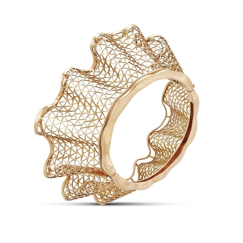 in oro giallo 18kt, realizzato a maglia traforata e ondulata, punzone del fascio, dim. cm 8,5x3,5x6,5, diam. interno cm 6 circa, gr. 65