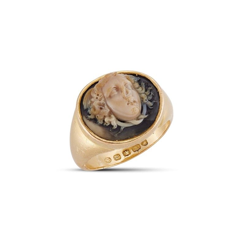 in oro giallo 22kt, recante sulla sommità un cammeo in calcedonio raffigurante il volto del Dio Hermes a rilievo, firmato "Bulgari", punzoni inglesi, mis. 61, gr. 17