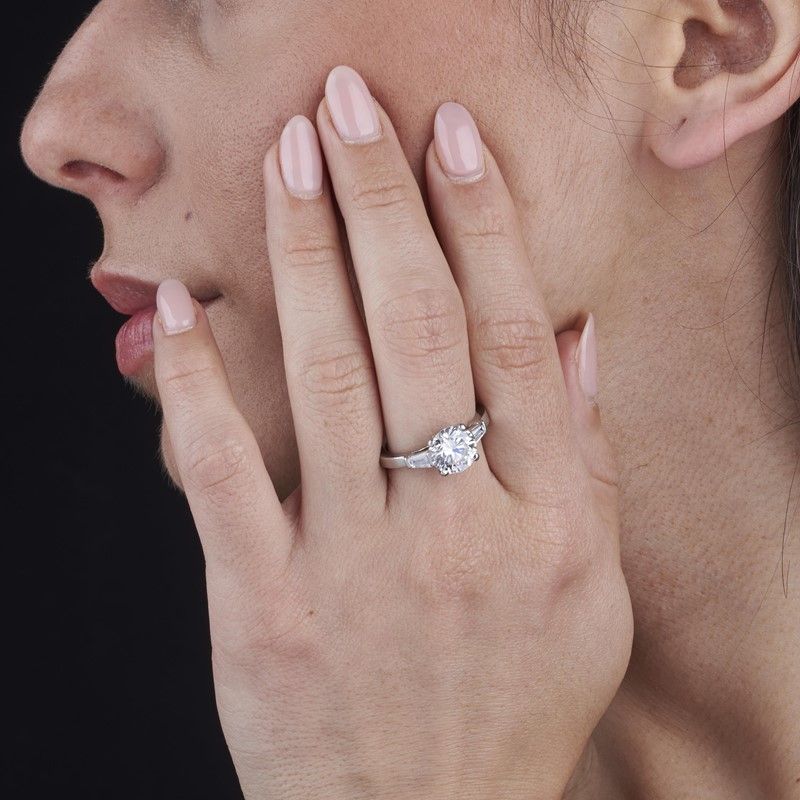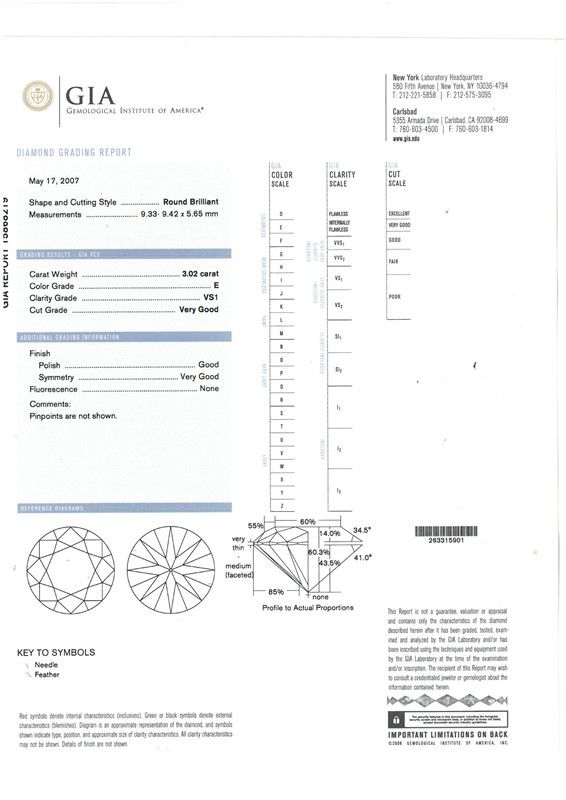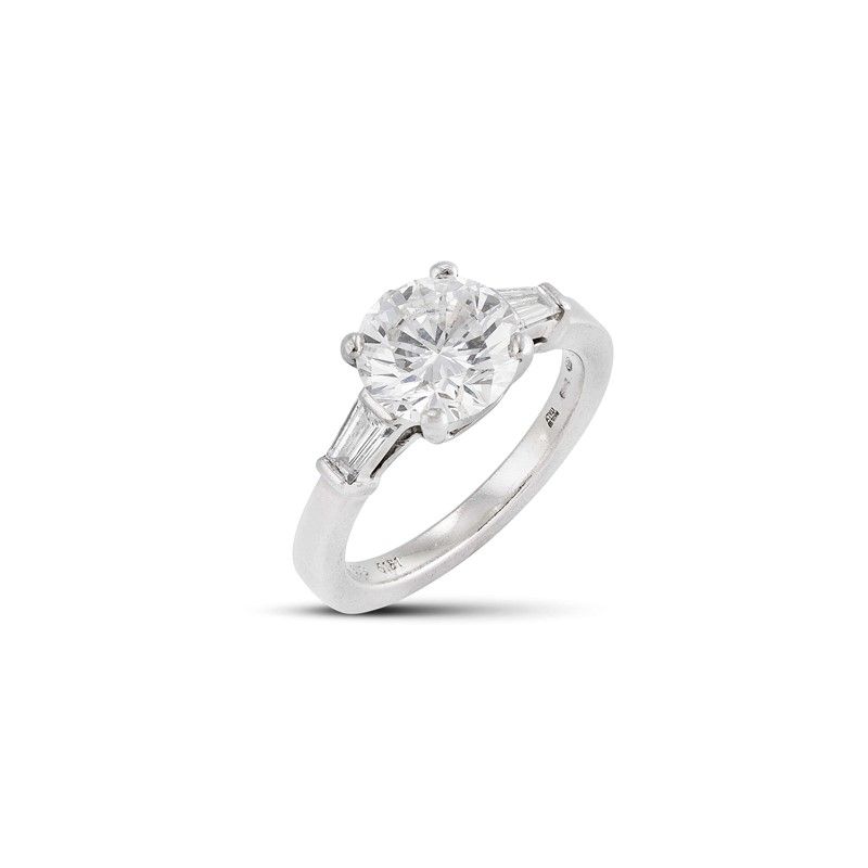 in platino, al centro un diamante taglio brillante di ct 3.02, colore E, purezza Vs1, affiancato da due diamanti taglio tapes per ct 0.40 circa, firmato Bulgari, punzoni 750, del fabbricante e n. seriale, mis. 58, gr. 8. Corredato di scatola e certificato GIA del 17/05/2007 attestante le caratteristiche.