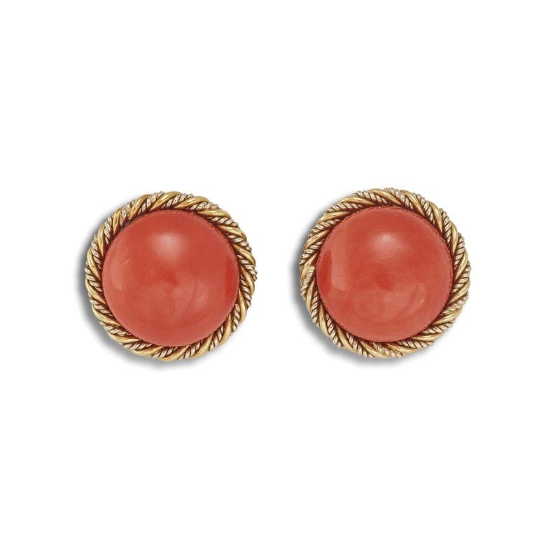 in oro giallo e bianco 18kt, con al centro due grandi bottoni in corallo taglio cabochon di mm 20x11 circa, cinti da un motivo a cordicella, firmati "Bulgari", punzone 750, chiusura a clip, gr. 31 complessivi
