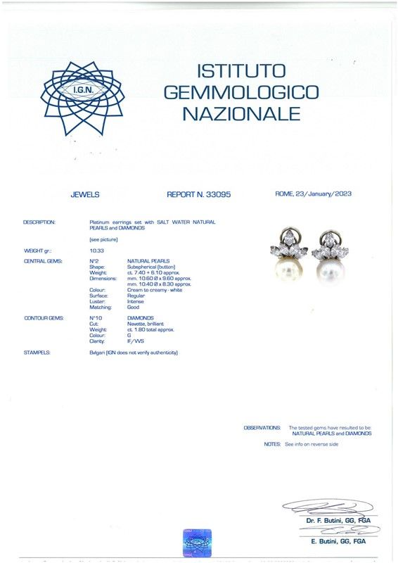 BULGARI PAIO DI ORECCHINI CON PERLE NATURALI E DIAMANTI in platino, impreziositi da due perle di mm 10.60x9.60 circa e 10.40x8.30 circa, sormontati da diamanti taglio navette per ct 1.80 circa, firmati "Bulgari", chiusura a clip, dim. cm 1x2 circa, gr. 10 complessivi. Corredati di scatola e certificato IGN del 23/01/2023 attestante le caratteristiche.
