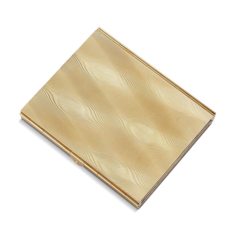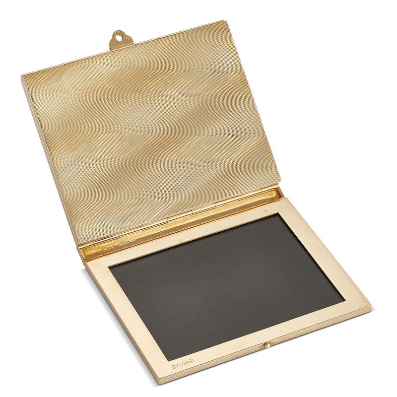 BULGARI PORTAFOTO in oro giallo 18kt, ripiegabile in tre parti andando a formare una piccola scatola, con superficie raffigurante un motivo zigrinato secondo la tecnica guilloché, firmato "Bulgari", punzoni 750, del fabbricante e numero seriale, gr. 159. Corredato di scatola.
