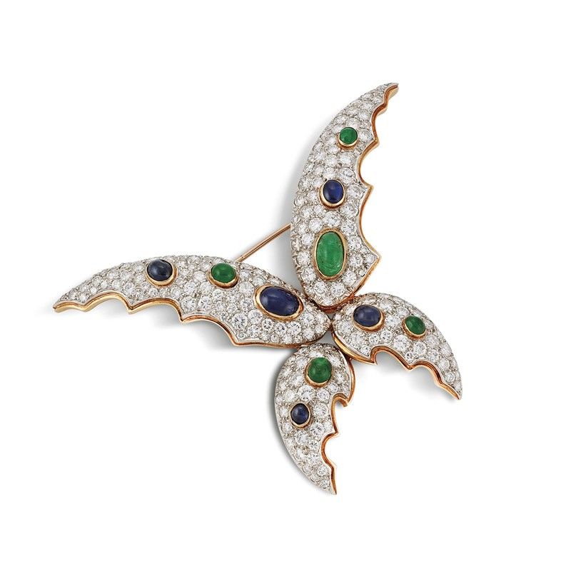 BULGARI SPILLA A FORMA DI FARFALLA in oro giallo e bianco 18kt, impreziosita da zaffiri e smeraldi taglio cabochon per ct 1.90 circa, smeraldi taglio cabochon per ct 1.50 circa e da pavé di diamanti taglio brillante per ct 6 circa, firmata "Bulgari", punzoni francesi e del fabbricante, dim. cm 7,5x6, gr. 27