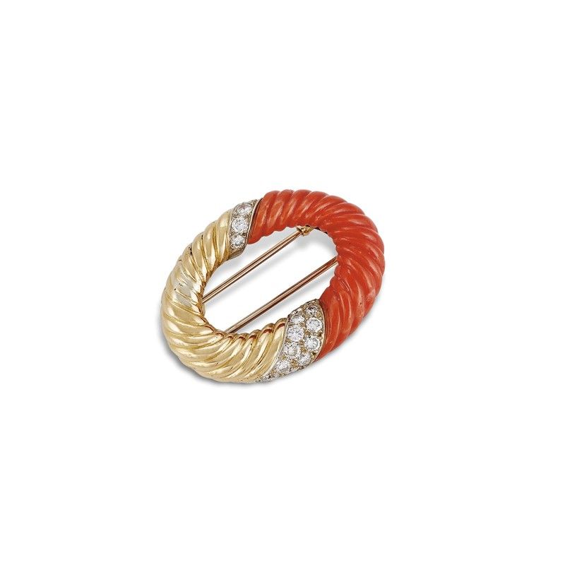 BULGARI CORAL AND DIAMOND OVAL BROOCH IN 18KT YELLOW GOLD AND PLATINUM