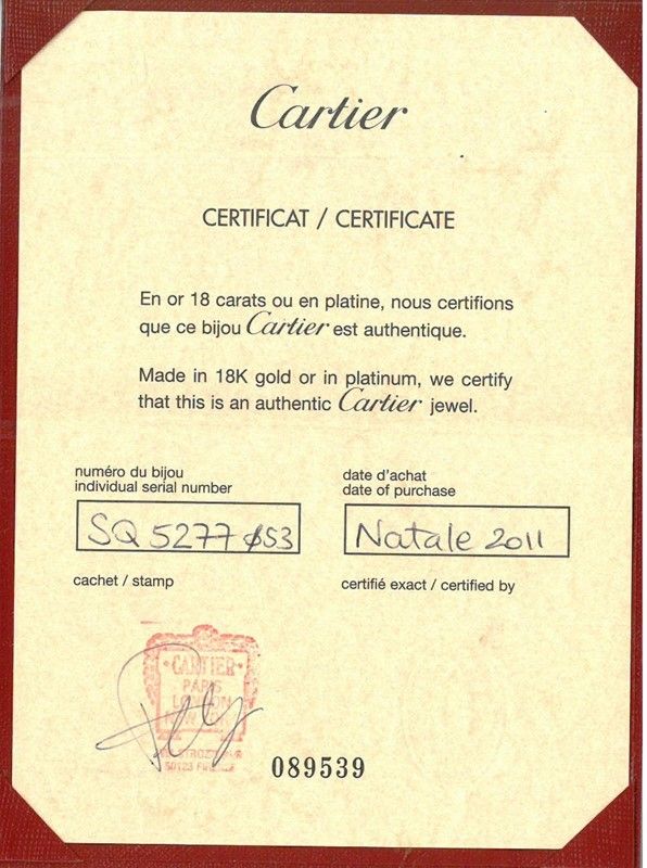 in oro tre colori, con le iconiche tre fedi unite tra loro, firmato "Cartier", punzone 750, n. SQ5277, mis. 53, gr. 8. Corredato di scatola e garanzia.