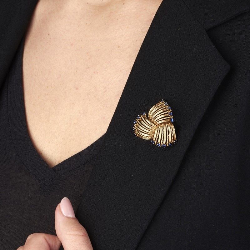CARTIER LONDON SPILLA CON ZAFFIRI in oro giallo 18kt, composta da tre fasci intrecciati con parti lavorate a cordicella, impreziositi all'estremità da zaffiri taglio cabochon per ct 0.70 circa, firmata "Cartier", n. LO203, dim. cm 3x3 circa, gr. 8. Corredata di lettera di Cartier del 19/12/2022.