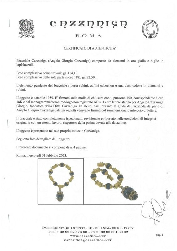 in oro giallo e bianco 18kt, composto da una serie concatenata di elementi cilindrici alternati a boules in lapislazzuli di mm 13 circa, da cui pende un ciondolo con una grande sfera in lapislazzuli di mm 25 circa, impreziosito da zaffiri e rubini taglio rotondo e cabochon per ct 3 circa, pietre semipreziose taglio carré e diamanti taglio huit huit per ct 0.30 circa, punzoni 750 e del fabbricante, lungh. cm 23, dim. pendente cm 2,5x4,5, gr. 114. Corredato di scatola e certificato di autenticità del 01/02/2023.