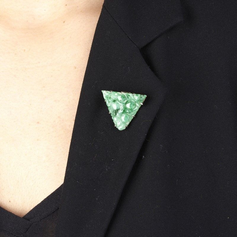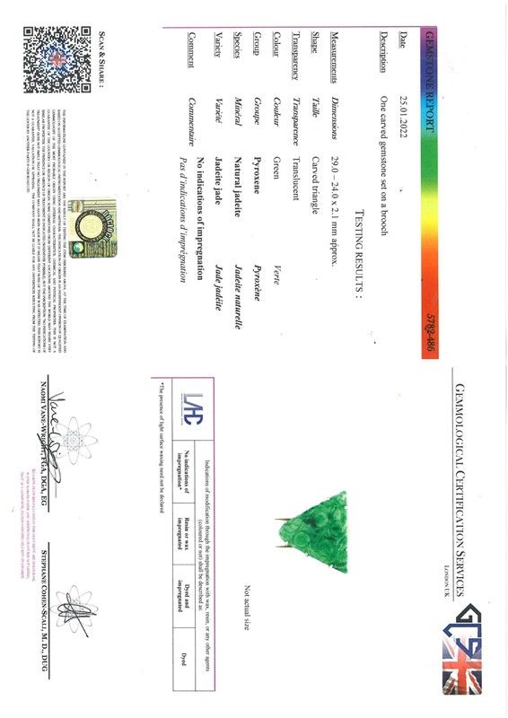 in oro bianco 18kt, recante un elemento triangolare in giadeite incisa di dim. mm 29x24x2 circa, gr. 6. Corredata di certificato GCS del 25/01/2022 attestante le caratteristiche e l'assenza di sostanze impregnanti.