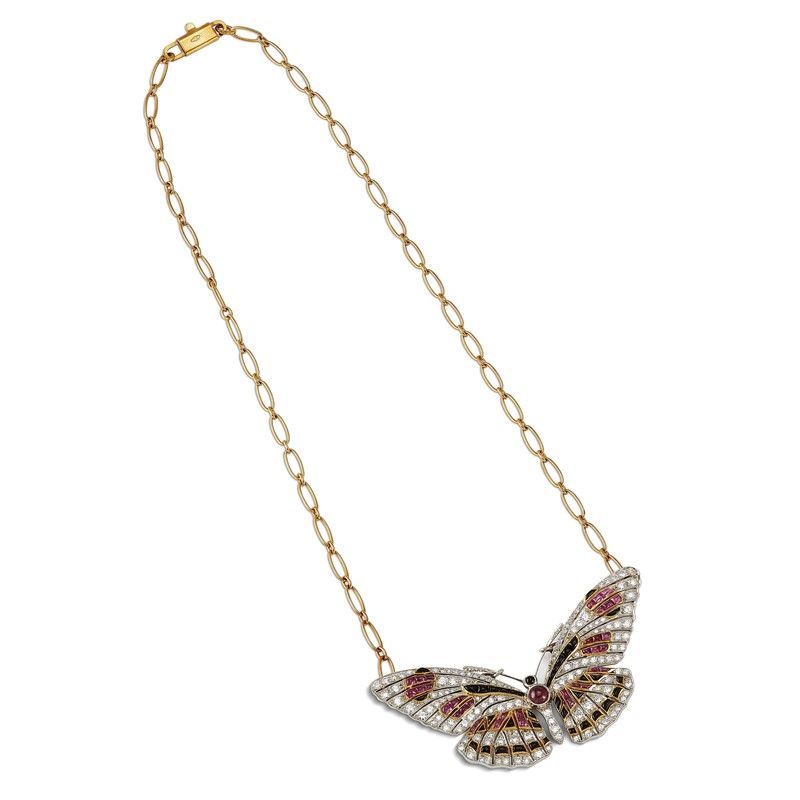 COLLANA A FORMA DI FARFALLA composta da catena in oro giallo 18kt e pendente in platino a forma di farfalla convertibile in spilla, impreziosita da onice e rubini taglio cabochon e diamanti taglio brillante per ct 1.20 circa, punzone 750, lungh. cm 38, gr. 14