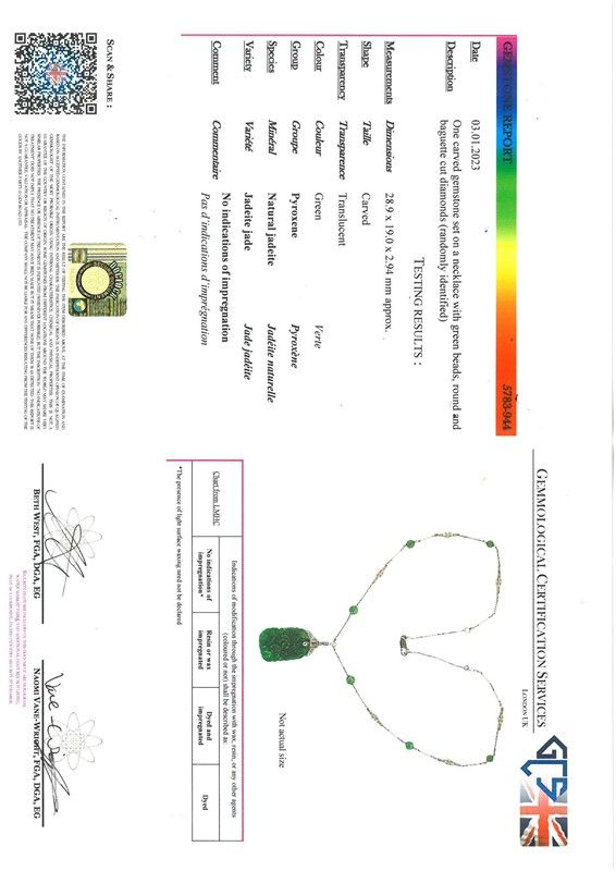 COLLANA CON PENDENTE IN GIADEITE E DIAMANTI in platino, composta da catena con sfere in calcedonio di mm 5 circa e ciondolo in giadeite incisa, impreziosita da diamanti taglio baguette e brillante per ct 0.30 circa, punzone PT 950, lungh. cm 39, gr. 11. Corredata di certificato GCS del 03/01/2023 attestante le caratteristiche e l'assenza di sostanze impregnanti.