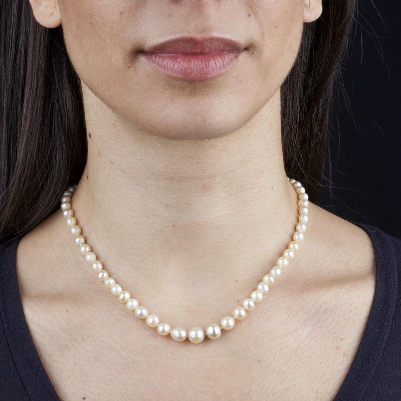 COLLANA DI PERLE NATURALI ad un filo di perle naturali digradanti di mm 8.95/4.80 circa, fermatura in oro e argento a forma di fiore con perla centrale di mm 7.40/7.50 circa e corolla di diamanti taglio vecchio e a rosa per ct 1.30 circa, lungh. cm 41, gr. 23. Corredata di certificato IGN del 23/03/2023 attestante le caratteristiche.