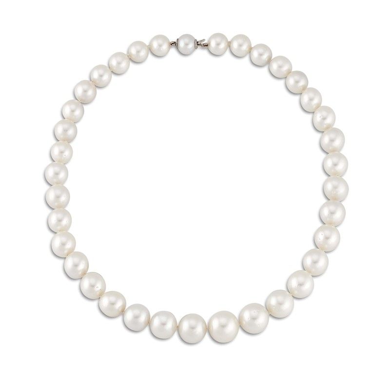 composta da un filo di perle south sea digradanti di mm 15-11 circa, punzone 750, fermatura in oro bianco 18kt, lungh. cm 48, gr. 104