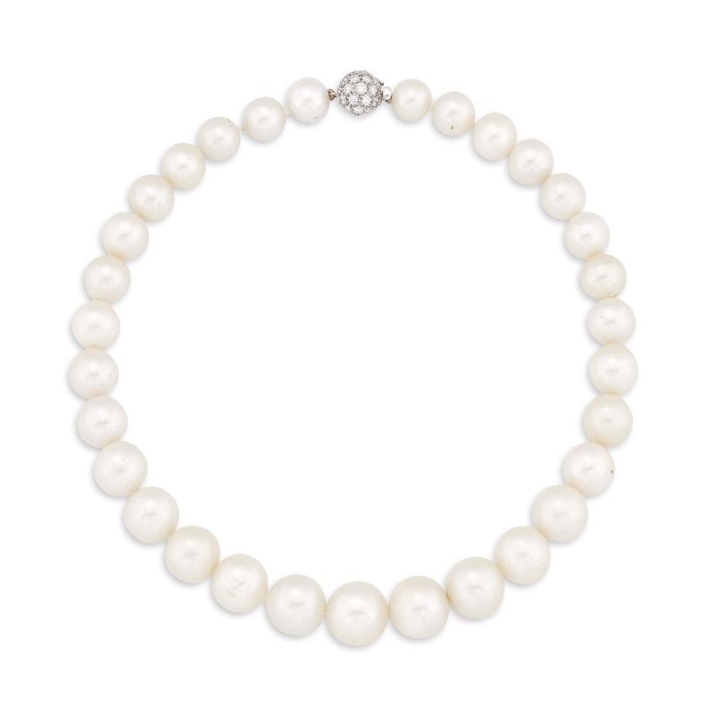 ad un filo di perle digradanti di mm 14-11 circa, fermatura in oro giallo e bianco 18kt impreziosita da diamanti taglio brillante per ct 1 circa, lungh. cm 40, gr. 91