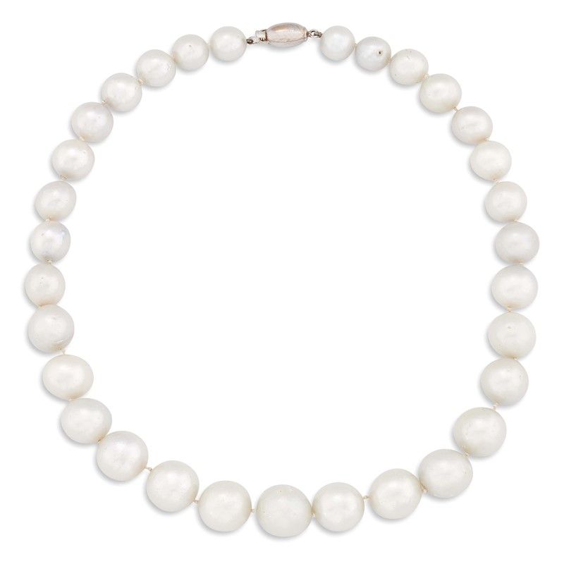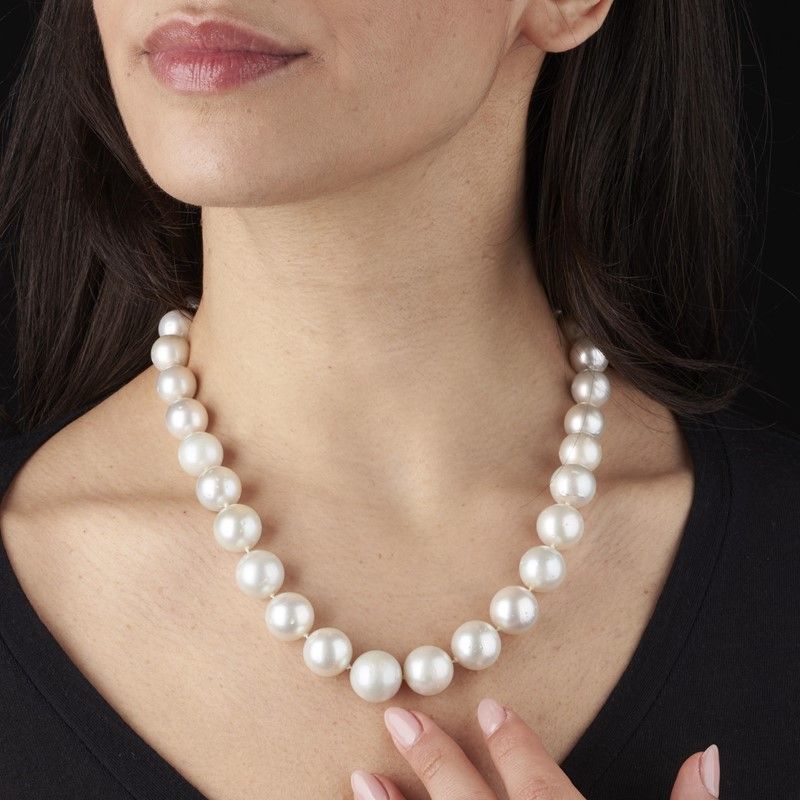 ad un filo di perle south sea digradanti di mm 15-11 circa, fermatura in oro bianco 18kt, punzone 750, lungh. cm 48, gr. 117