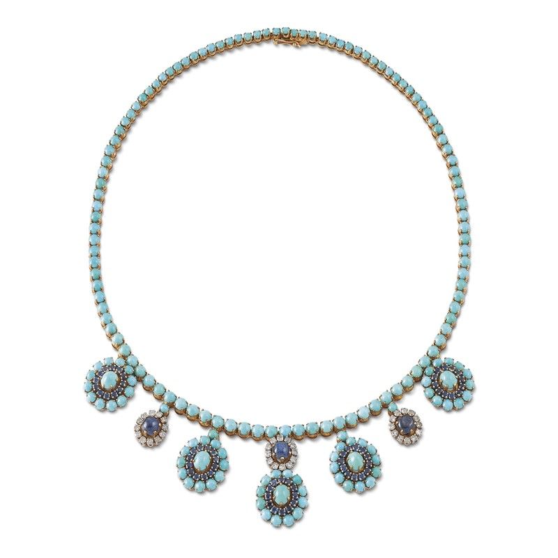 COLLANA FLOREALE CON TURCHESI ZAFFIRI E DIAMANTI in oro 14kt, composta da una fila di turchesi taglio cabochon leggermente digradanti, da cui pendono sette pendenti a forma di fiori e impreziositi da turchesi taglio cabochon, zaffiri taglio rotondo e cabochon per ct 4 circa e diamanti taglio huit huit per ct 0.70 circa, lungh. cm 39, gr.47