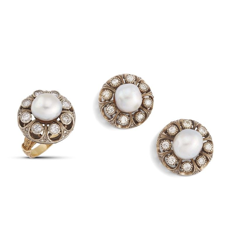 DEMI PARURE FLOREALE CON PERLE E DIAMANTI in oro bianco e giallo 18kt, composta da un anello con al centro una perla di mm 9 circa circondata da diamanti taglio brillante per ct 1.20 circa, punzone 750, mis. 56, completa di paio di orecchini en suite con perle centrali di mm 11 circa e circondate da diamanti taglio brillante per ct 2.40 circa, chiusura a clip removibile, indossabili anche come spille, gr. 34 complessivi