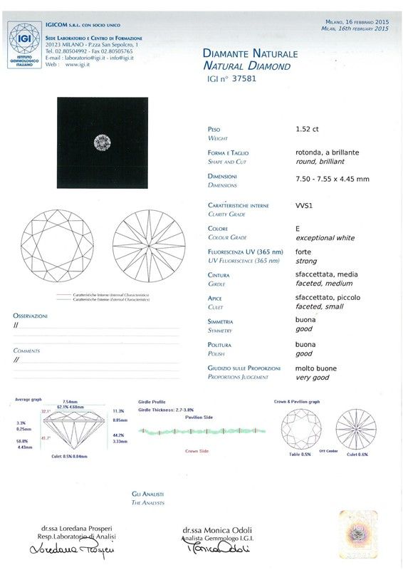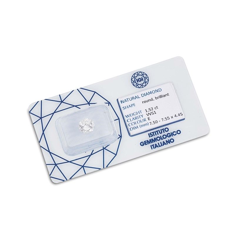di ct 1.52, taglio brillante, colore E, purezza Vvs1. Corredato di certificato IGI del 16/02/2015 attestante le caratteristiche.