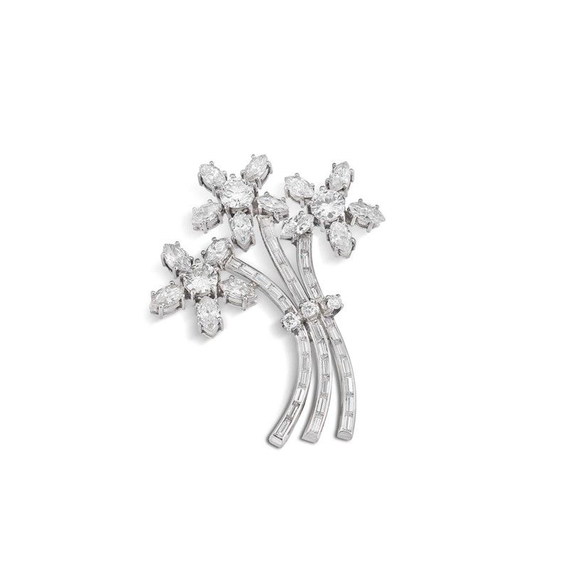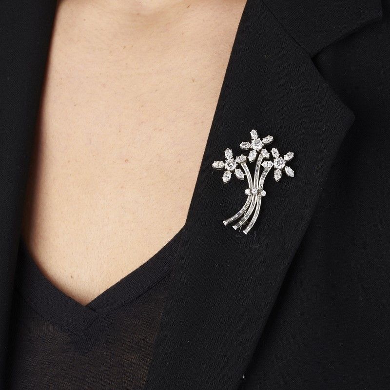 FURST SPILLA A FORMA DI MAZZO FIORITO CON DIAMANTI in platino, impreziosita da diamanti taglio brillante, navette e baguette per ct 4.50 circa, firmata "FURST", punzone del fabbricante, dim. cm 3x4, gr. 9