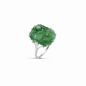 ANELLO CON GIADEITE INCISA in oro bianco 18kt, impreziosito da una giadeite incisa di ct 2.50 circa, mis. 62, [..]