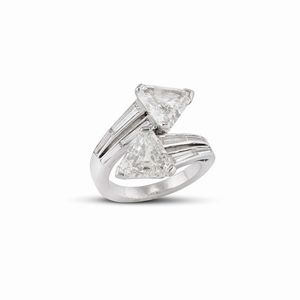 ANELLO CONTRARIE CON DIAMANTI in platino, impreziositi agli apici da due diamanti taglio trilliant per ct 2 circa, [..]
