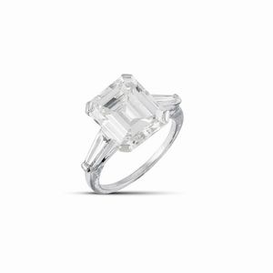 ANELLO CON DIAMANTI in oro bianco 18kt, con al centro un diamante taglio smeraldo di ct 7.06, colore M, purezza [..]