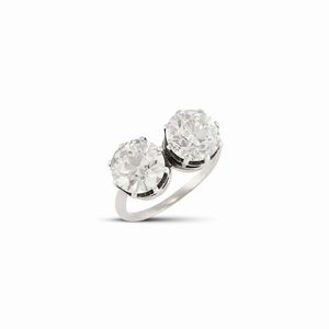 ANELLO CON DIAMANTI in oro bianco 18kt, impreziosito da due diamanti taglio vecchio di ct 2.70 circa e 2.80 circa, [..]