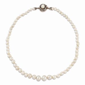 COLLANA DI PERLE NATURALI ad un filo di perle naturali digradanti di mm 8.95/4.80 circa, fermatura in oro e argento [..]