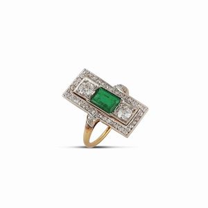 ANELLO GEOMETRICO CON SMERALDO E DIAMANTI in oro e platino, impreziosito al centro da uno smeraldo taglio ottagonale [..]
