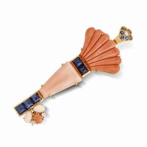 MORONI SPILLA-PENDENTE CON CORALLI ZAFFIRI E DIAMANTI in oro giallo 18kt, realizzata a forma di chiave, composta [..]