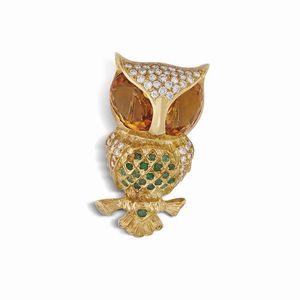 SPILLA A FORMA DI GUFO CON QUARZI SMERALDI E DIAMANTI in oro giallo 18kt, impreziosita da due grandi quarzi citrini [..]