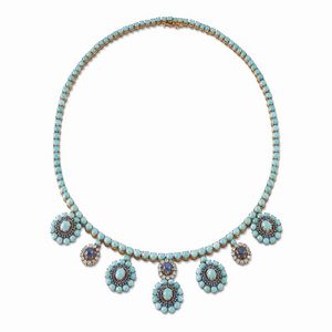 COLLANA FLOREALE CON TURCHESI ZAFFIRI E DIAMANTI in oro 14kt, composta da una fila di turchesi taglio cabochon [..]