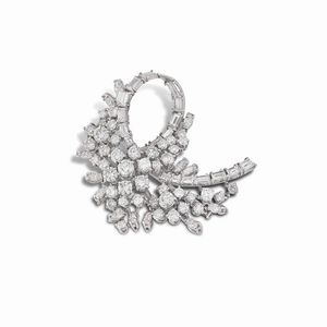SPILLA A TRALCIO FIORITO in oro bianco 18kt, impreziosita da diamanti taglio vecchio e baguette per ct 3.50 circa, [..]