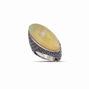 GRANDE ANELLO CON OPALE E DIAMANTI NERI in oro bianco 18kt, dall'aspetto geometrico che ricorda la forma di un'ellisse, [..]