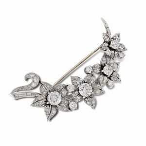 SPILLA A TRALCIO FIORITO in oro bianco 18kt, impreziosita da diamanti taglio vecchio e baguette per ct 3.50 circa, [..]