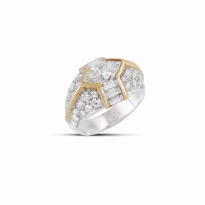 ANELLO CON DIAMANTI in oro giallo e bianco 18kt, impreziosito al centro da un diamante taglio navette di ct 1 [..]