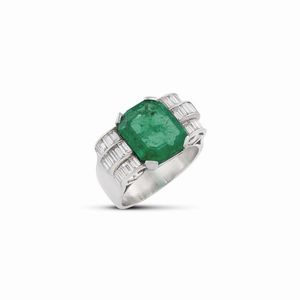 ANELLO A FASCIA CON SMERALDO COLOMBIANO E DIAMANTI in platino, con al centro uno smeraldo di ct 4.15 circa (difetti), [..]