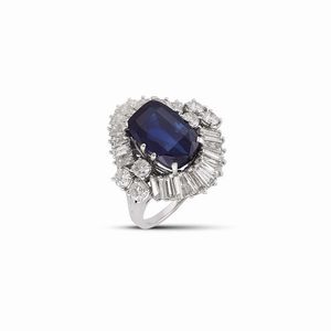 ANELLO CON ZAFFIRO E DIAMANTI in oro bianco 18kt, con al centro uno zaffiro taglio cuscino di ct 9.50 circa, affiancato [..]
