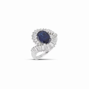 ANELLO CON ZAFFIRO E DIAMANTI in oro bianco 18kt, impreziosito al centro da uno zaffiro taglio ovale di ct 2.62, [..]